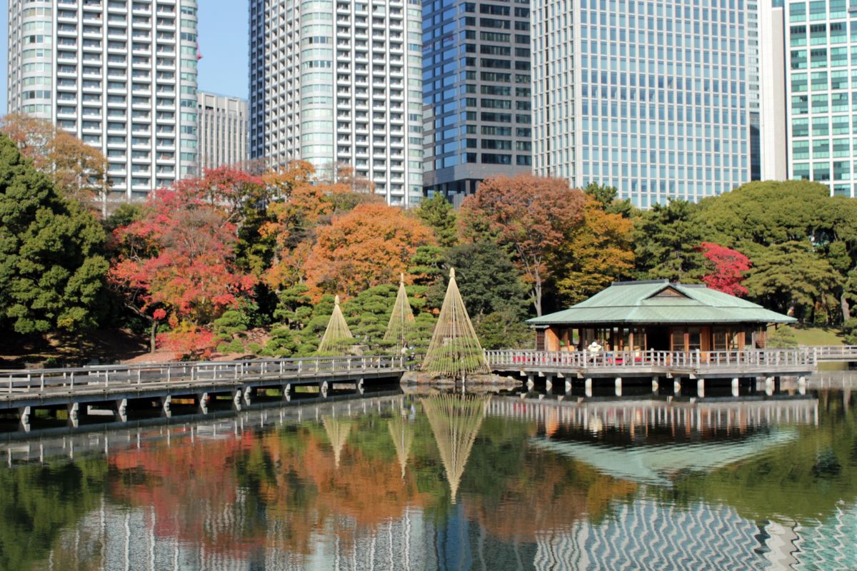 Un giardino feudale dell’epoca Edo che si apre, come un sipario, sul moderno quartiere di Shiodome. Le foglie dorate si specchiano nei grattacieli e sembrano danzare con loro: passato e presente intrecciati in un’unica inquadratura.