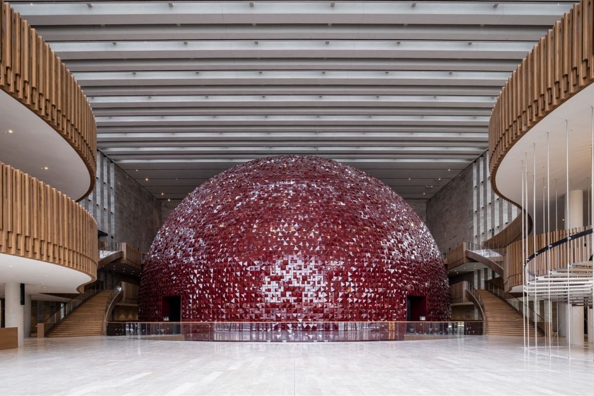 La facciata dell’imponente edificio anni ‘60 è stata resa più trasparente per mettere in evidenza il rosso del volume della sala principale, a forma di semisfera. Nella parte superiore dell’edificio principale trova spazio un ristorante con vista panoramica sul Bosforo. I materiali impiegati sono tutti “made in Turkey”, dai pannelli murali in ceramica, al guscio della sala principale rivestito con ceramiche rosse appositamente progettato.