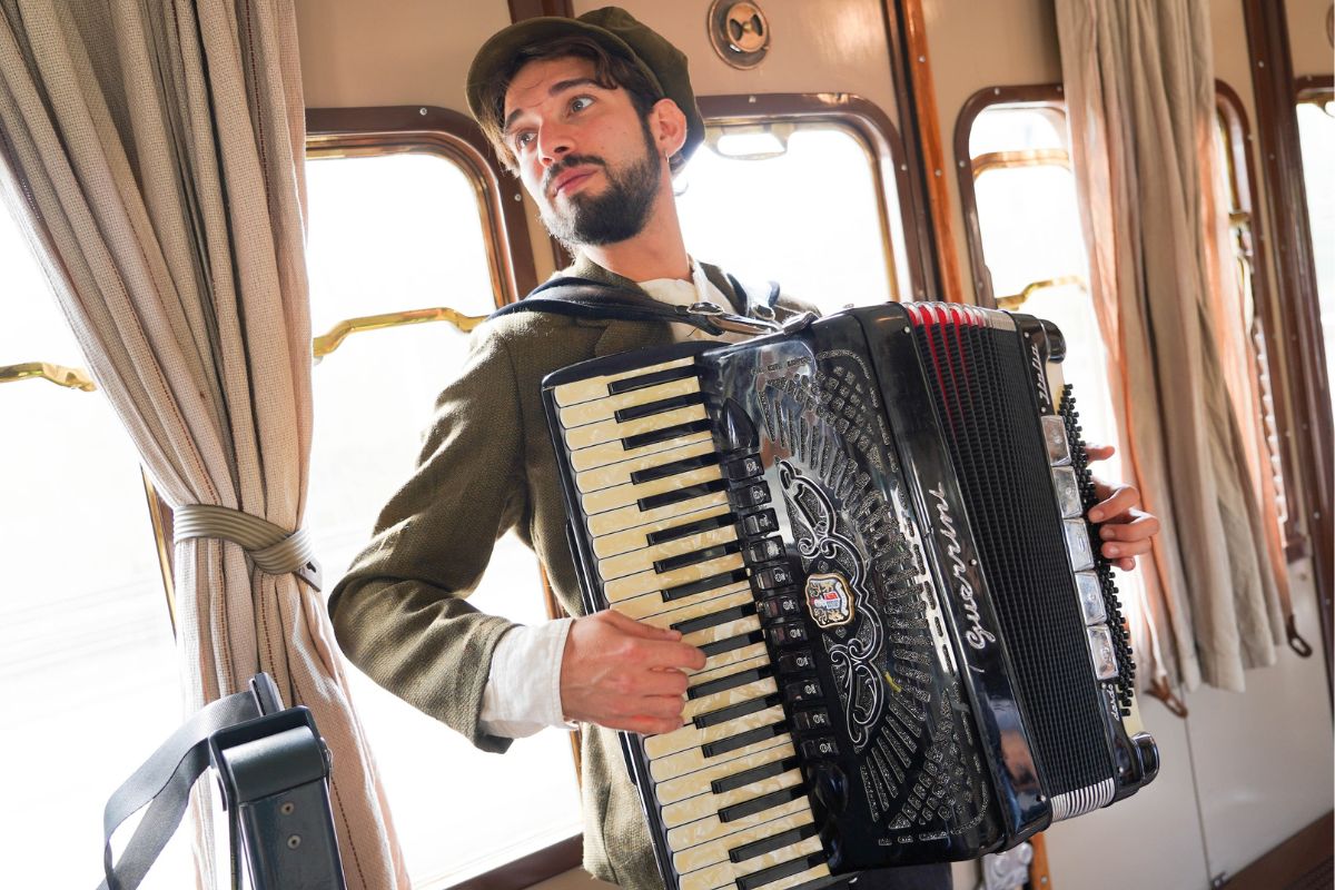 L’antica linea ferroviaria inaugurata nel 1874 e riattivata nel 2014 collega Agrigento Bassa a Porto Empedocle, attraversando la Valle dei Templi, uno dei paesaggi più iconici al mondo. A bordo delle carrozze storiche “Terrazzini” degli anni ’30, il pubblico è guidato da undici performer in un racconto che intreccia teatro, letteratura, musica e memoria. Prendono vita gli scrittori Pirandello, Camilleri e Sciascia, ma anche figure meno conosciute oggi, come la cantante Lina Termini, un’agrigentina celebre in Italia negli anni ’30, che incise brani come “Ma l’amore no” e “Lili Marlene”.