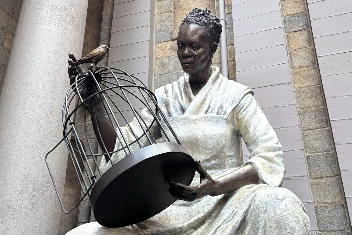 “Unbound” ha una presenza imponente nel cortile della King’s Chapel; è come una figura matriarcale della diaspora africana. Indossa un abito bianco e fluente, è seduta con in mano una gabbia per uccelli con la porta aperta, dando ai volatili l’opportunità di liberarsi.